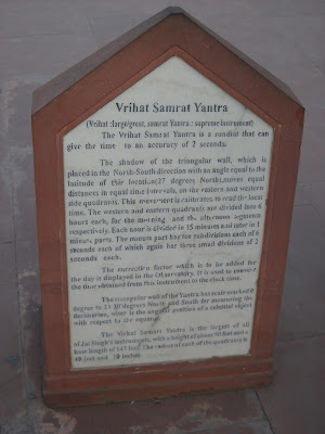The gem in the Jantar Mantar’s crown is the 90 foot (27 m) tall Sun Dial (World’s largest) (also called Samrat Yantra) which tells you the time with an accuracy of 2 seconds. Jeetendra Singh, our guide, pointed out one important fact, “The Sun Dial can tell you the exact time at Jaipur. But since Indian standard time is derived from